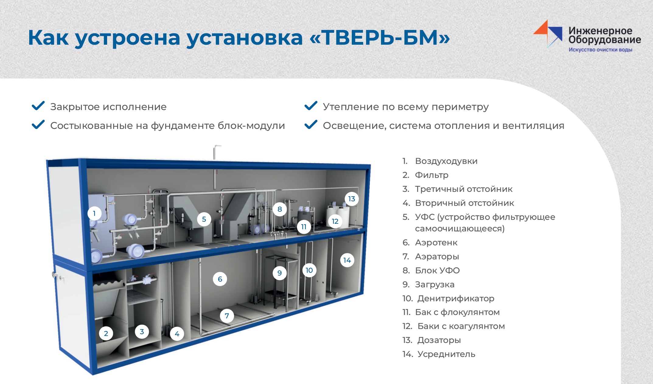 «ТВЕРЬ-БМ» – локальные очистные сооружения блочно-модульного типа, предназначенные для биологической очистки хозяйственно-бытовых и аналогичных по составу сточных вод. Станции выпускаются в закрытом исполнении и собираются из компактных блок-модулей, установленных на фундамент. Такое решение обеспечивает утепленное здание с размещением всего технологического оборудования внутри, а также значительно сокращает сроки монтажа и ввода объекта в эксплуатацию.