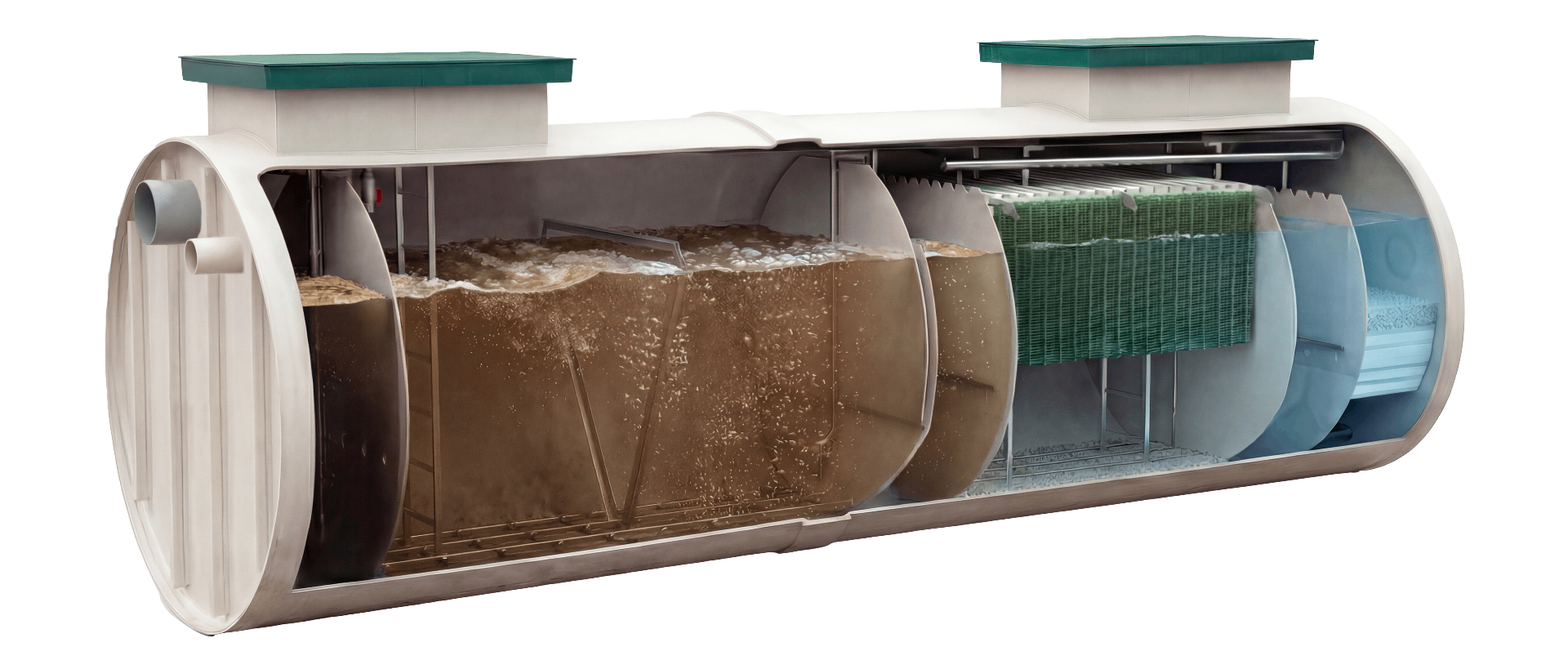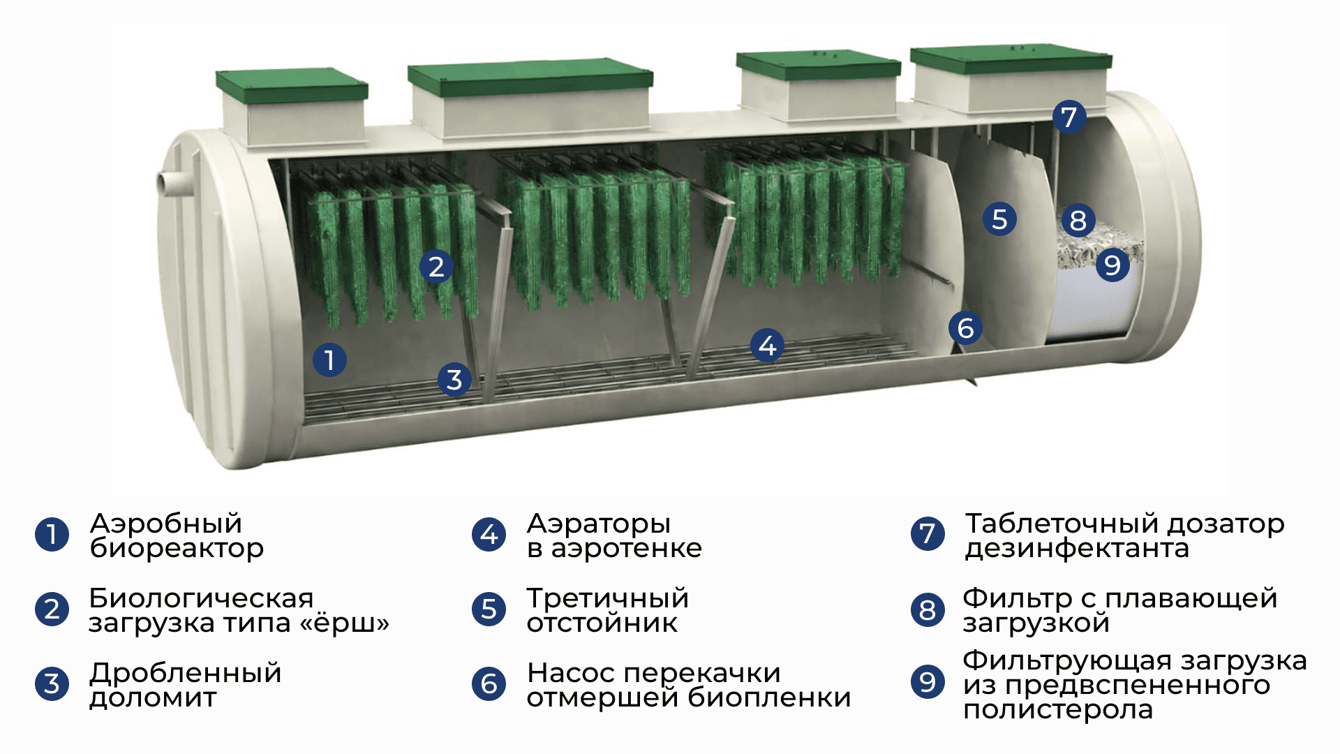 Предназначен для биологического окисления основной массы органических загрязнений сточных вод. Процесс очистки осуществляется активным илом — сообществом аэробных микроорганизмов, которые в присутствии растворенного кислорода расщепляют и потребляют органические вещества, обеспечивая эффективное снижение БПК и ХПК.