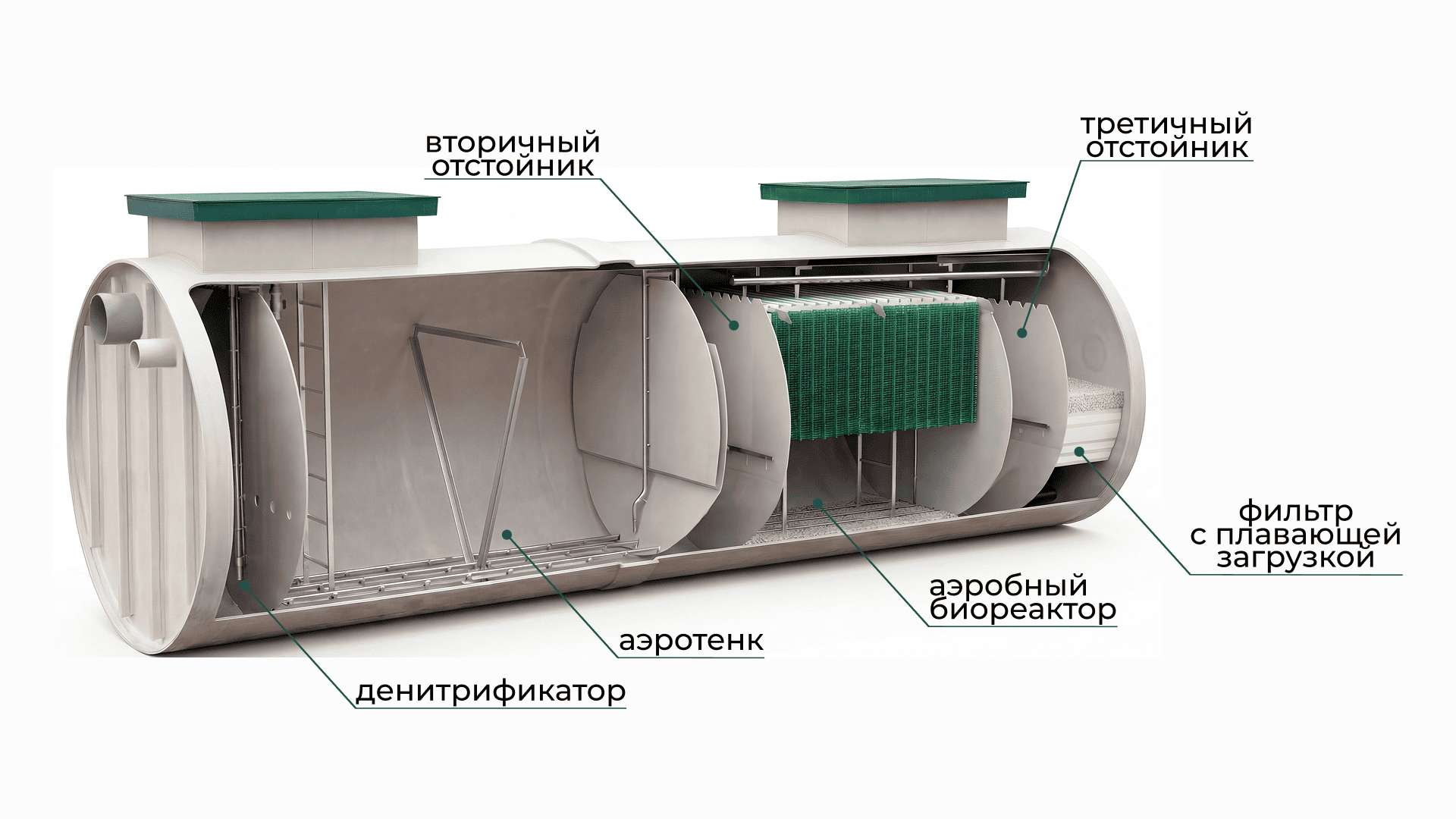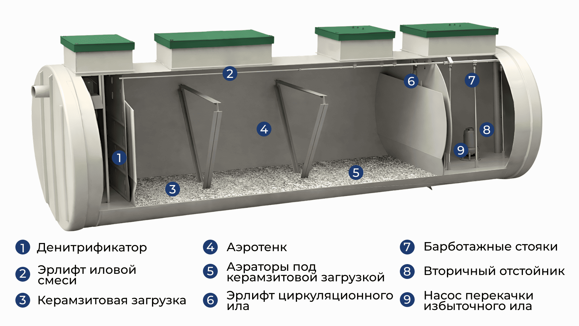 Предназначен для глубокой нитрификации — биологического окисления аммонийного азота до нитратов. Процесс осуществляется нитрифицирующими бактериями в условиях интенсивной аэрации, что обеспечивает эффективное удаление азота из сточных вод и подготовку стоков к последующей денитрификации.